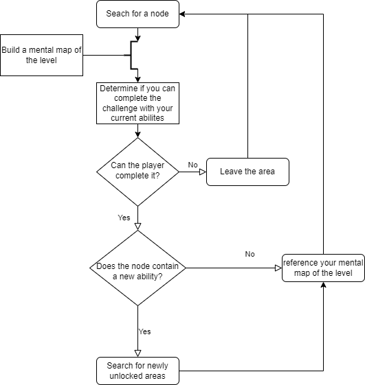 This flowchart was for how I wanted the players to think, encompasing both the Metroidvania and the Randomiser aspect. It is interesting that a Metroidvania relies on exploring, creating your own mental map and remembering landmarks - while a randomiser relies and tests the players knowledge of the game map. This was one of the bigger problems of the vertical slice is actually the focus on the randomiser since in the expo enviroment where the game was showed it off, people rarely got to play it more than once.